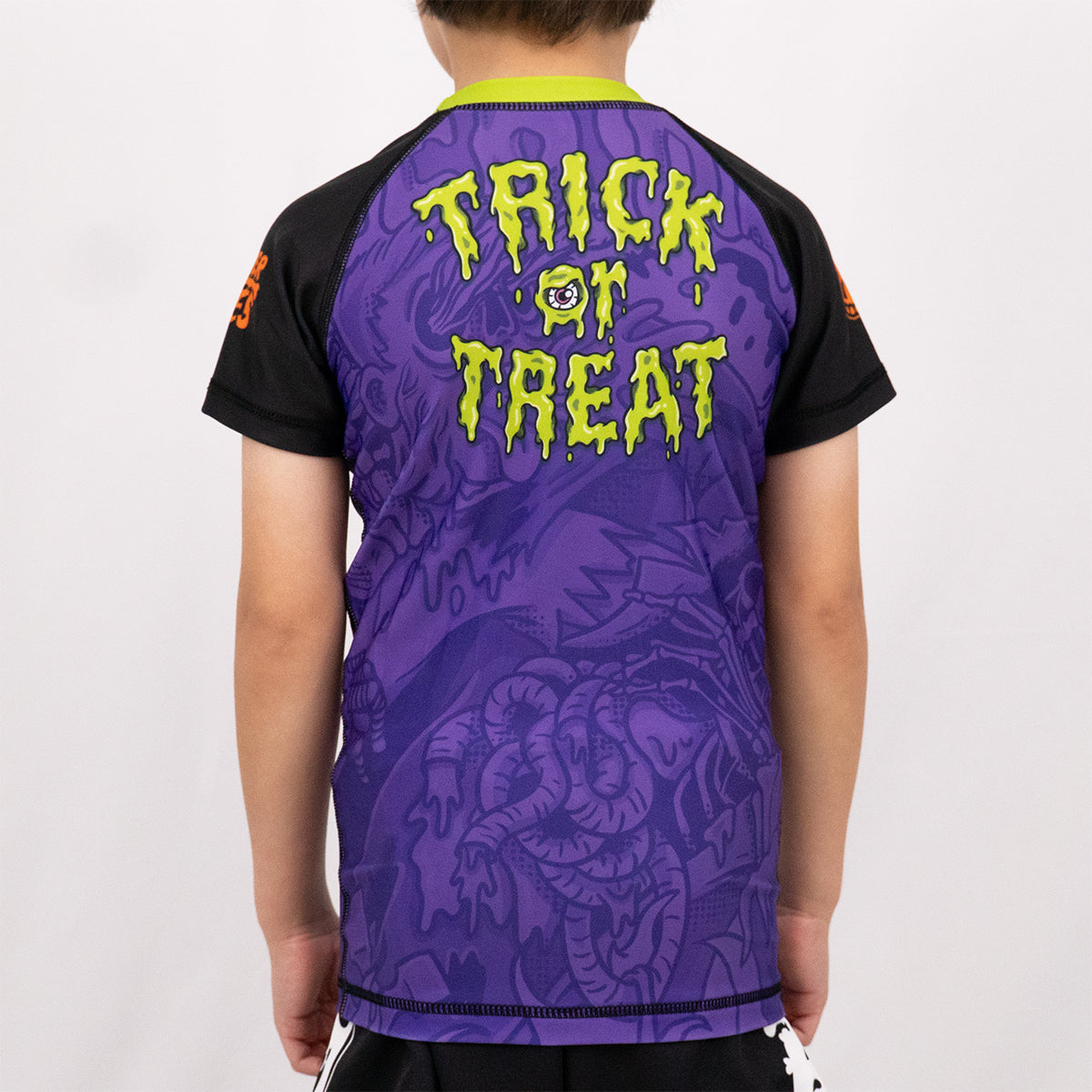 The Trick or Treat Kids Rash Guard brings Halloween to the mats! Designed by Rubber Bones, this piece is packed with spooky energy and bright, monster-fueled artwork. The purple base and slime-green details make it perfect for young grapplers who love to stand out.