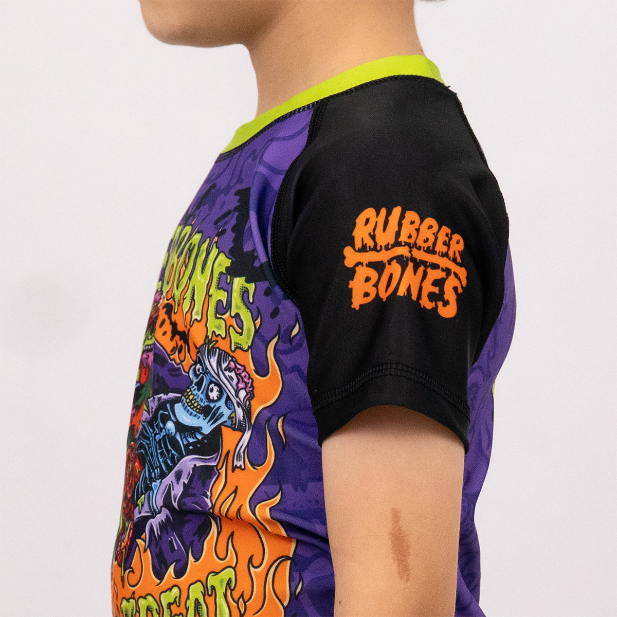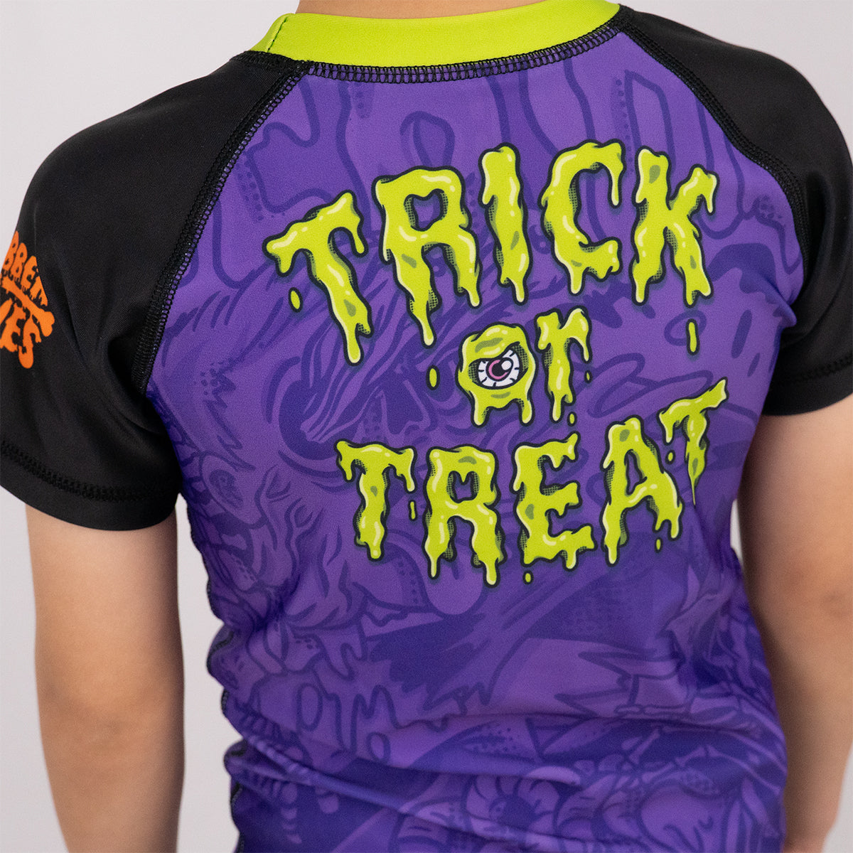 The Trick or Treat Kids Rash Guard brings Halloween to the mats! Designed by Rubber Bones, this piece is packed with spooky energy and bright, monster-fueled artwork. The purple base and slime-green details make it perfect for young grapplers who love to stand out.